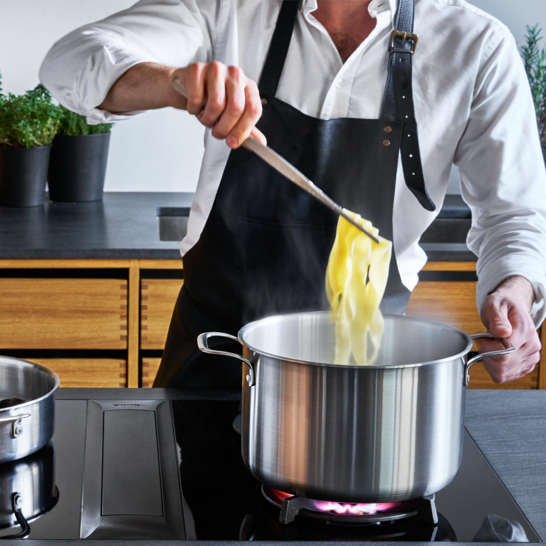 Wir haben Dänemarks Spitzenköche gefragt, wie die ultimative Topf- und Pfannenserie aussehen sollte, und hier ist sie. Ausgestattet mit professionellen Details wie einem Schüttrand und Materialien, die in den besten Restaurants der Welt verwendet werden. Das Set umfasst einen 7-Liter-Topf, einen 4-Liter-Topf, einen 2,5-Liter-Topf und einen 1,5-Liter-Topf. Mit diesen vier vielseitigen Größen haben Sie alles, was Sie brauchen, egal ob Sie Brühe machen, einen Eintopf zubereiten oder eine Sauce Béarnaise verquirlen.