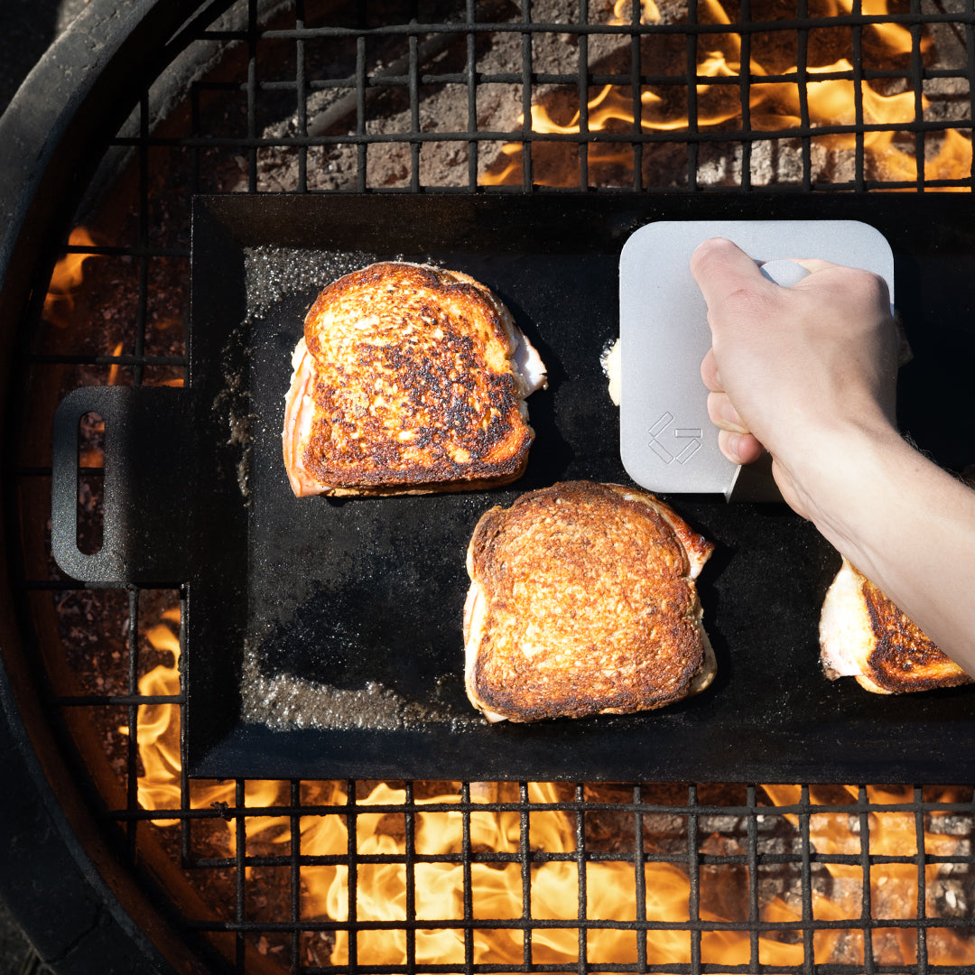 Im Gegensatz zu einer gerippten Grillpfanne bietet die Grillplatte eine maximale Kochfläche – und mit dem Smasher erhöhen Sie den Kontakt zwischen Ihren Zutaten und der Platte, um perfekte Ergebnisse zu erzielen, sei es bei der Zubereitung von Smash-Burgern, perfekt flachem Speck oder Toasts. Die Anwendung ist einfach: Stellen Sie den Feuerständer und die Grillplatte auf, entzünden Sie Ihr Feuer und kochen Sie direkt auf der Grillplatte – oder verwenden Sie die Grillplatte als mobilen Herd für Ihren Topf.