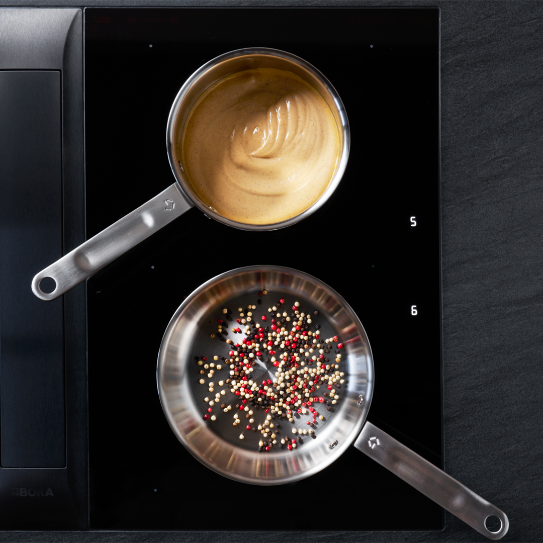 Dank des Aluminiumkerns, der eine hervorragende Wärmeleitung bietet, können Sie die Temperatur schnell und präzise regulieren. Anders als bei Kochgeschirr mit aufgesetztem Sandwichboden breitet sich die Hitze auf natürliche Weise an den Seiten der Pfanne aus, da die gesamte Pfanne aus einer 5-ply Konstruktion besteht - ideal zum Emulgieren von Cremes und Verquirlen von Soßen.