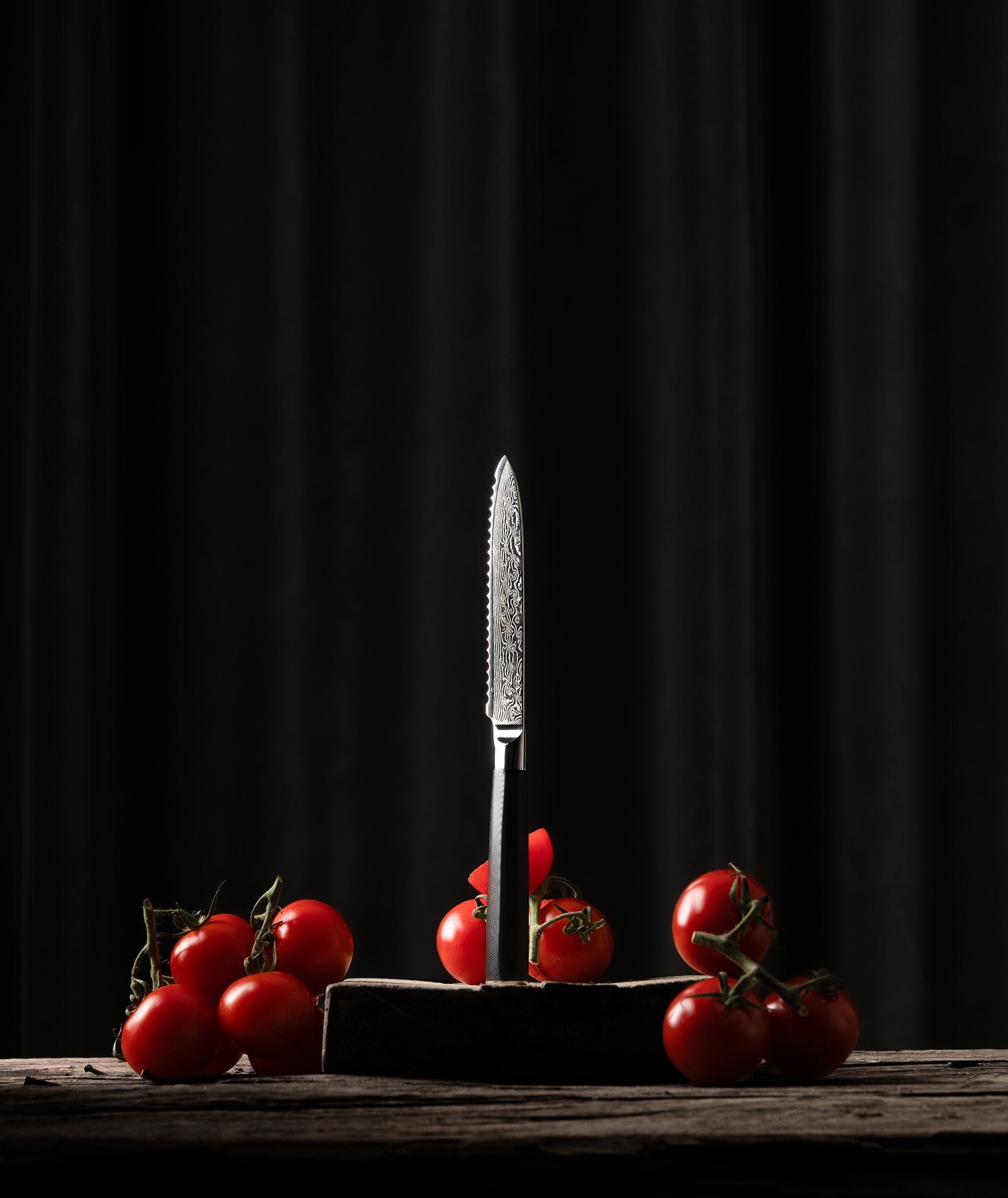Die gezackte Kante erhält die Schärfe des Messers über lange Zeit, sodass Sie selbst nach intensivem Gebrauch weiterhin Tomaten schneiden können und dabei einen sichereren und präziseren Schnitt erzielen. Die kompakte Größe bedeutet, dass das Messer nicht viel Platz in Ihrer Küche einnimmt oder wenn Sie es auf eine Wanderung oder ein Picknick mitnehmen.
