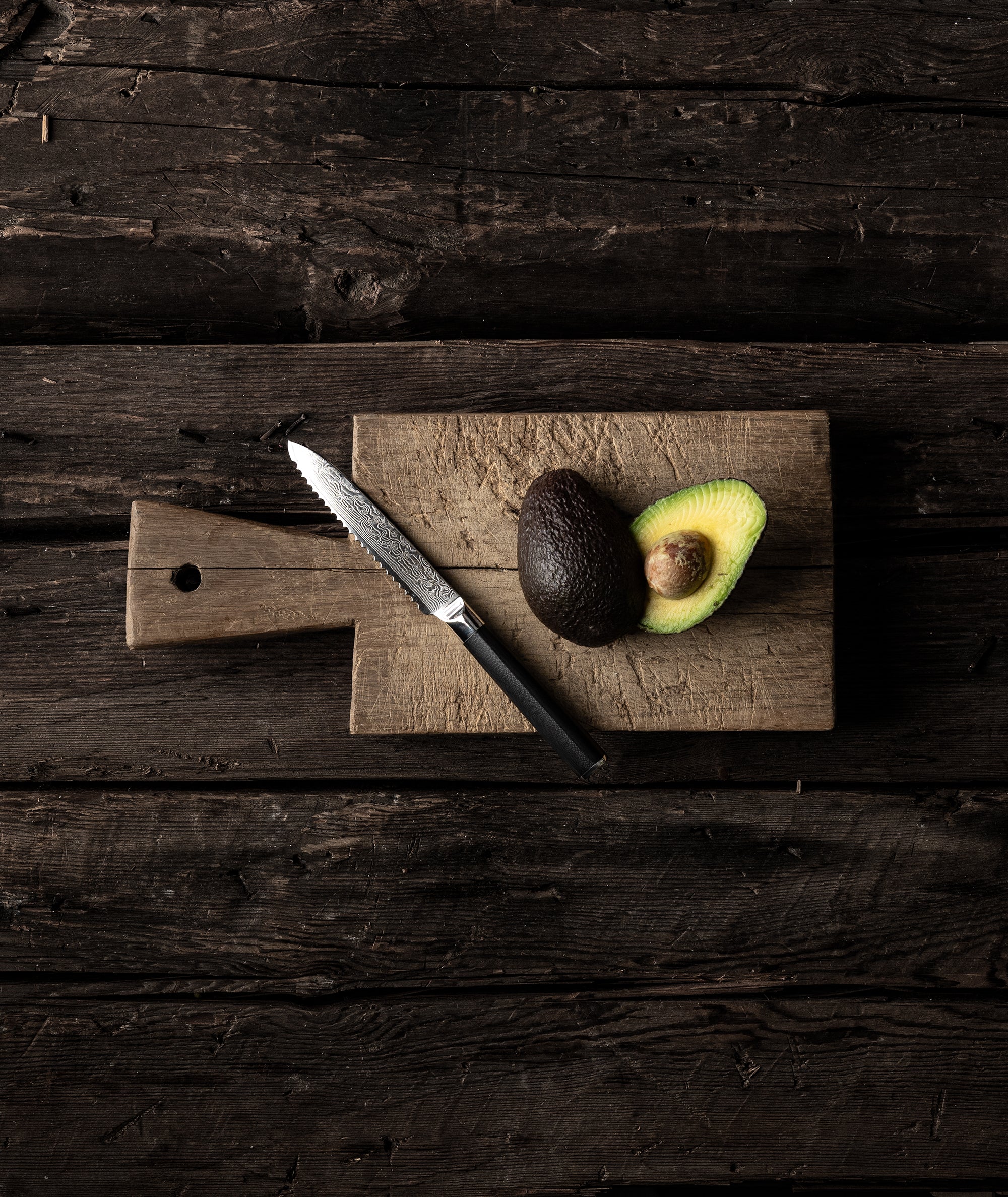 Erleben Sie die unvergleichliche Vielseitigkeit unseres gezackten Universalmessers. Es liegt zwischen einem klassischen Kochmesser und einem Schälmesser und ist perfekt für eine Vielzahl von kulinarischen Aufgaben. Ob saftige Tomaten, Hartkäse, Wurstwaren oder knuspriges Brot - die gezackte Kante schneidet mühelos durch harte Außenflächen, ohne die empfindlichen Innenseiten zu zerreißen.
