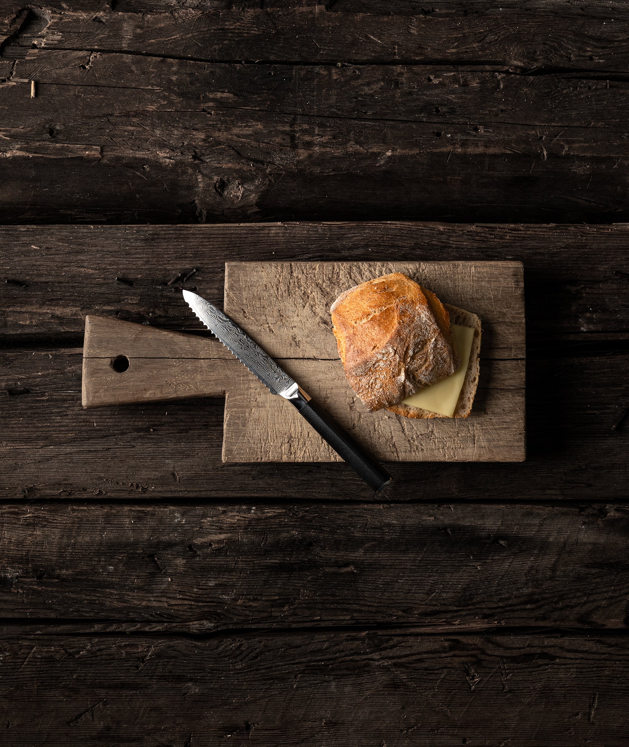 Entdecken Sie die unvergleichliche Vielseitigkeit unseres gezackten Universalmessers. Perfekt für eine breite Palette von kulinarischen Aufgaben, schneidet es mühelos durch harte Außenflächen und bewahrt gleichzeitig die Integrität weicher Innenbereiche.