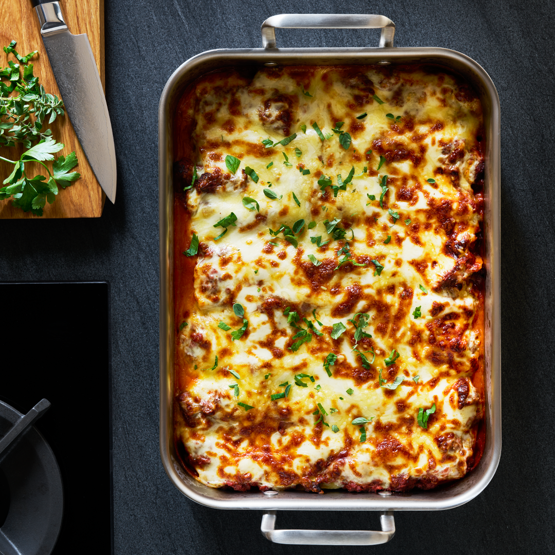 Die Backblech gewährleistet eine gleichmäßige und schnelle Wärmeverteilung dank ihrer fünfschichtigen Konstruktion, im Gegensatz zu den typischen dreischichtigen Konstruktionen der meisten Edelstahlkochgeschirre. Eine gleichmäßige und effiziente Wärmeleitung ist unerlässlich, egal ob Sie Lasagne zubereiten, Focaccia backen oder Wurzelgemüse im Ofen rösten.
